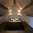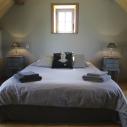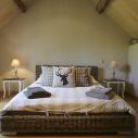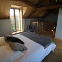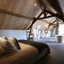 Chambre paisible et lumineuse : ses couleurs beiges mettent en valeur sa charpente ancienne.